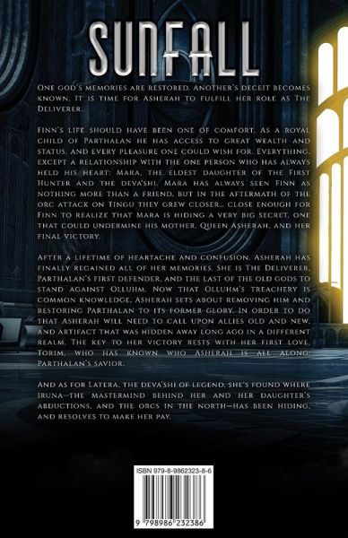 One god's memories are restored. Another's deceit becomes known. It is time for Asherah to fulfill her role as The Deliverer. Finn's life should have been one of comfort. As a royal child of Parthalan he has access to great wealth and status, and every pleasure one could wish for. Everything, except a relationship with the one person who has always held his heart: Mara, the eldest daughter of the First Hunter and the deva'shi. Mara has always seen Finn as nothing more than a friend, but in the aftermath of the orc attack on Tingu they grew closer... close enough for Finn to realize that Mara is hiding a very big secret, one that could undermine his mother, Queen Asherah, and her final victory. After a lifetime of heartache and confusion, Asherah has finally regained all of her memories. She is The Deliverer, Parthalan's first defender, and the last of the old gods to stand against Olluhm. Now that Olluhm's treachery is common knowledge, Asherah sets about removing him and restoring Parthalan to its former glory. In order to do that Asherah will need to call upon allies old and new, and artifact that was hidden away long ago in a different realm. The key to her victory rests with her first love, Torim, who has known who Asherah is all along: Parthalan's savior. And as for Latera, the deva'shi of legend, she's found where Iruna-the mastermind behind her and her daughter's abductions, and the orcs in the north-has been hiding, and resolves to make her pay. Sunfall, book six of The Chronicles of Parthalan