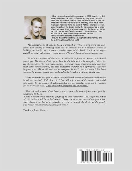 The edit and re-issue of this book is dedicated to James H. Simon, a dedicated genealogist. My sincere thanks go to him for the information he compiled before the age of computers. His work was compiled over many years of research using only 3x5 index cards, scribbled notes, and then transferred to paper on a typewriter. I can only imagine how difficult this task was to complete in 1987. Simon's research has been treasured by amateur genealogists, and used as the foundation of many family trees. This edit and re-issue of his book promotes James Simon's original stated goal for developing his book. "I hope I can influence others to get going on their family tree. The longer one puts it off, the harder it will be to find answers. Every day more and more of our past is lost, either through the loss of irreplaceable records or through the deaths of the people who "lived" the information genealogists seek." Thank you James Simon...