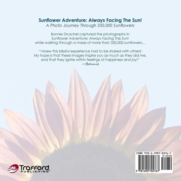 Sunflower Adventure: Always Facing the Sun!-a Photo Journey through 350,000 Sunflowers The photographs in Sunflower Adventure: Always Facing the Sun! were captured while I walked through a maze of over 350,000 sunflowers. What I felt was bliss! I knew this experience had to be shared with others. My hope is that these images will inspire you as much as they inspired me and that they ignite within you a feeling of happiness and joy. -Bonnie