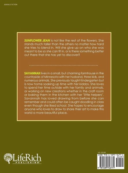 Sunflower Jean is not like the rest of the flowers. She stands much taller then the others no matter how hard she tries to blend in. Will she give up on who she was meant to be so she can fit in, or is there something better out there that she has yet to discover?