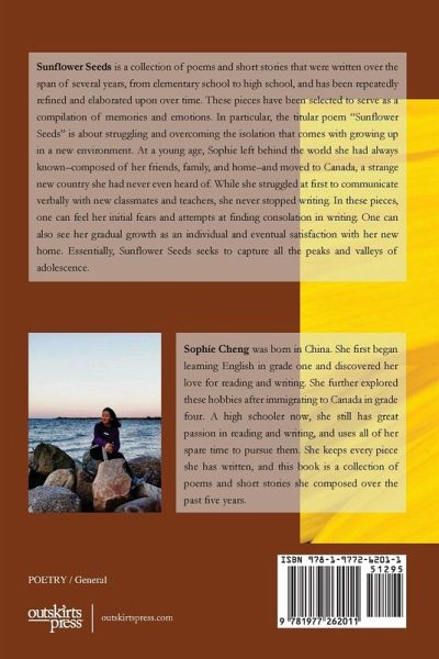 Sunflower Seeds is a collection of poems and short stories that were written over the span of several years, from elementary school to high school, and has been repeatedly refined and elaborated upon over time. These pieces have been selected to serve as a compilation of memories and emotions. In particular, the titular poem "Sunflower Seeds" is about struggling with and overcoming the isolation and loneliness that comes with growing up in a new environment. At a young age, Sophie left behind the world she had always known-composed of her friends, family, and home-and moved to Canada, a strange new country she had never even heard of. While she struggled at first to communicate verbally with new classmates and teachers, she never stopped writing. In these pieces, one can feel her initial fears and attempts at finding consolation in writing. One can also see her gradual growth as an individual and eventual satisfaction with her new home. Essentially, Sunflower Seeds seeks to capture all the peaks and valleys of adolescence.