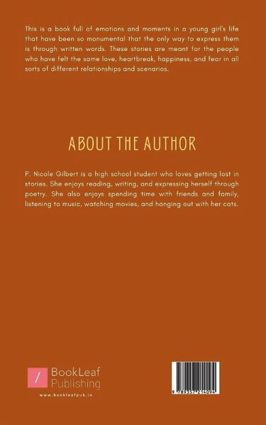 This is a book full of emotions and moments in a young girl's life that have been so monumental that the only way to express them is through written words. These stories are meant for the people who have felt the same love, heartbreak, happiness, and fear in all sorts of different relationships and scenarios.