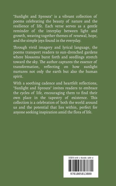 "Sunlight and Sprouts" is a vibrant collection of poems celebrating the beauty of nature and the resilience of life. Each verse serves as a gentle reminder of the interplay between light and growth, weaving together themes of renewal, hope, and the simple joys found in the everyday. Through vivid imagery and lyrical language, the poems transport readers to sun-drenched gardens where blossoms burst forth and seedlings stretch toward the sky. The author captures the essence of transformation, reflecting on how sunlight nurtures not only the earth but also the human spirit. With a soothing cadence and heartfelt reflections, "Sunlight and Sprouts" invites readers to embrace the cycles of life, encouraging them to find their own place in the tapestry of existence. This collection is a celebration of both the world around us and the potential that lies within, perfect for anyone seeking inspiration amid the flora of life.