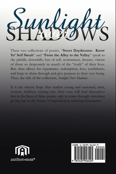 These two collections of poems, "Sweet Daydreams: Know Yo' Self Sistah" and "From the Alley to the Valley" speak to the pitfalls, downfalls, loss of self, womanness, dreams, visions of those so desperately in search of the "truth" of their lives. But, then allows for repentance, redemption, love, confidence, and hope to shine through and give purpose to their very being. Thus, the title of the collection, Sunlight Over Shadows. It is my sincere hope that readers young and seasoned, men, women, children coming into their own will find themselves lost in the lines of these poems only to come through victorious giving way to the beauty of imperfection radiating humanness.