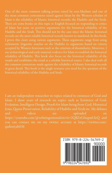One of the most common talking points raised by non-Muslims and one of the most common contentions raised against Islam by the Western scholars of Islam is the reliability of Islamic historical records, the Hadiths and the Sirah. There are some books on this topic in English focused on responding to critics of Islam but none on positive arguments for the historical reliabiltiy of the Hadiths and the Sirah. This should not be the case since the Islamic historical records are the most reliable historical records known to mankind. In this book, I prove this claim using various arguments. These arguments range from using stylometric lingusitic anaylsis on the Hadiths to arguments based on criteria accepted by Western histroians such as the criterion of dissimilarity. Moreover, I use archaeological and early material evidence for Islam to establish the historical reliability of Hadiths. This book also focus on the historical reliability of the isnads and establishes the isnad as a reliable historical source. I also deal with all the common contenions made against the reliability of Islamic historical records in great detail. This book is the single resource you need for the question of the historical reliability of the Hadiths and Sirah.