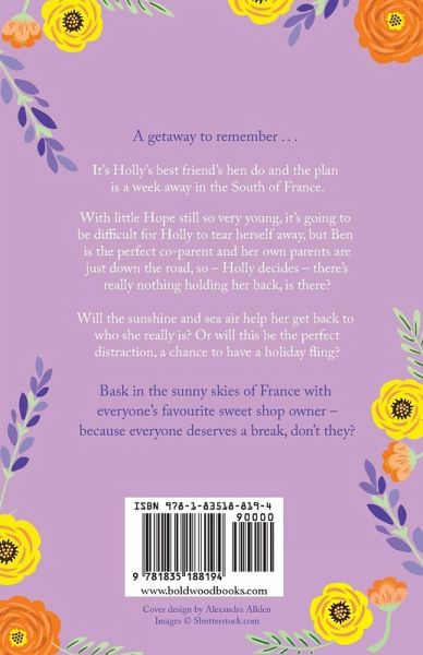 A getaway to remember... It's Holly's best friend's hen do and the plan is a week away in the South of France. With little Hope still so very young, it's going to be difficult for Holly to tear herself away, but Ben is the perfect co-parent and her own parents are just down the road, so - Holly decides - there's really nothing holding her back, is there? Will the sunshine and sea air help her get back to who she really is? Or will this be the perfect distraction, a chance to have a holiday fling? Bask in the sunny skies of France with everyone's favourite sweet shop owner - because everyone deserves a break, don't they?