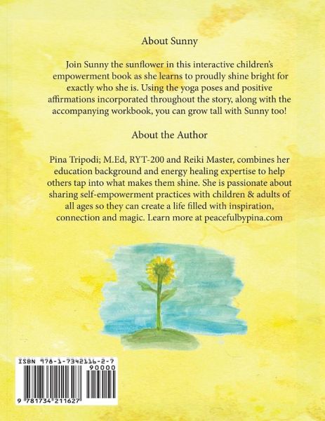Sunny Finds her Shine is an engaging children's empowerment book about a sunflower who searches far and wide for a place to fit in. Although she is told she is too tall and too bright, Sunny learns to shine proudly as her true self. Told in rhyme, this interactive book also includes yoga postures and positive affirmations integrated throughout the story, so as children find the words, they can can grow tall alongside Sunny. This is the first book in a series that focus on the themes of each energy center in our body. Sunny teaches us about the solar plexus through her story's themes: confidence, courage, self-worth, and self-esteem. Sunny Finds her Shine has an accompanying workbook filled with art, self-expression, and movement activities geared towards ages 5-8.