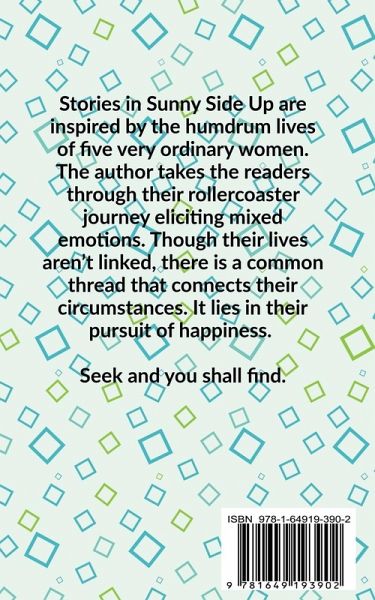 Stories in Sunny Side Up are inspired by the humdrum lives of five very ordinary women. The author takes the readers through their rollercoaster journey eliciting mixed emotions. Though their lives aren't linked, there is a common thread that connects their circumstances. It lies in their pursuit of happiness. Seek and you shall find.