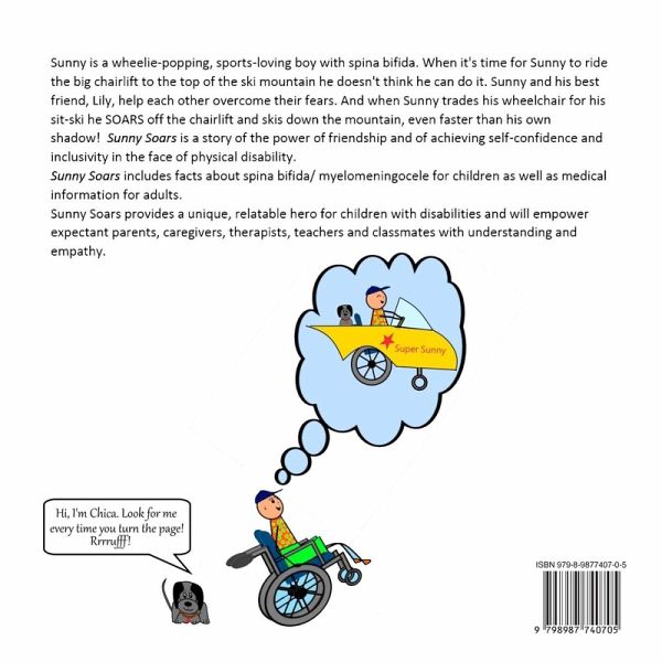 Sunny is a wheelie-popping, sports-loving boy with spina bifida. When it's time for Sunny to ride the big chairlift to the top of the ski mountain he doesn't think he can do it. Sunny and his best friend, Lily, help each other overcome their fears. And when Sunny trades his wheelchair for his sit-ski he SOARS off the chairlift and skis down the mountain, even faster than his own shadow! Sunny Soars is a story of the power of friendship and of achieving self-confidence and inclusivity in the face of physical disability. Sunny Soars includes facts about spina bifida/ myelomeningocele for children as well as medical information for adults. Sunny Soars provides a unique, relatable hero for children with disabilities and will empower expectant parents, caregivers, therapists, teachers and classmates with understanding and empathy.