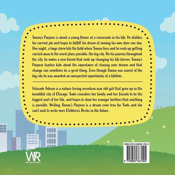 Sunny's Purpose is about a young flower at a crossroads in his life. He dislikes his current job and hopes to fulfill his dream of owning his own store one day. One night, a huge storm hits the field where Sunny lives and he ends up getting carried away to the worst place possible, the big city. On his journey throughout the city, he makes a new friend that ends up changing his life forever. Sunny's Purpose teaches kids about the importance of chasing your dreams and that change can sometimes be a good thing. Even though Sunny was scared of the big city he was awarded an unexpected opportunity of a lifetime.