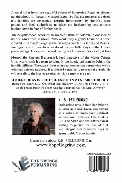 A serial killer hunts the beautiful streets of Sunnyside Road, an elegant neighborhood in Western Massachusetts. So far, six preteens are dead, and families are devastated. Despite involvement by the FBI, state police, and local authorities, no clues are forthcoming, and citizens hunker down in fear of further death. The neighborhood becomes an isolated island of potential bloodshed as no one can afford to move. Who would buy a grand home on a street cloaked in carnage? Sergei is the proud patriarch of a family of Russian immigrants who now lives in dread, as his little Anya is the killer's preferred age. He senses the evil nearby but knows not how to fight back. Meanwhile, Captain Beauregard, lead detective of the Major Crimes Unit, works with his team to identify the homicidal maniac behind the horrific killings. Through diligence and an interesting partnership with a criminal defense attorney, Beauregard ceaselessly pursues the truth. He will not allow the loss of another child, no matter the cost. OTHER BOOKS IN THE EVIL EXISTS IN WEST SIDE TRILOGY Book Two: Mary Lou: Oh, What Did She Do? ISBN: 978-1-951012-11-3 Book Three: Brothers From Another Mother: All For One! Always? ISBN: 978- 1-95 1012-16-8