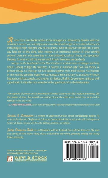 A letter from an erstwhile mother to her estranged son, distanced by decades, sends our omniscient narrator on a critical journey to narrate himself in light of a cruciform history and eschatological hope. Along the way, he encounters a cadre of failures in the faith that, in some way, help him to limp along. What emerges is an intertextual tapestry of prose covering personal crises and rude awakenings in moral philosophy, political theory, and apocalyptic theology. To what end will the journey lead? Arrivals themselves are dead ends. Sunrays on the Beachhead of the New Creation is a hybrid novel of dialogue and fever dreams. Serving multiple life sentences, it borrows its narrative logic from film theory, or perhaps biology, no, theology: rub two subjects together and a third emerges. Accompanied by the stunning pointillist imagery of Judy Langemo Roth, this story is a sandbox of literary fragments, misfitted, angular, and invasive. It's hilarious, like life. Do you enjoy curling up with a good book? It's like that, but instead of with a good book, it's in the fetal position.