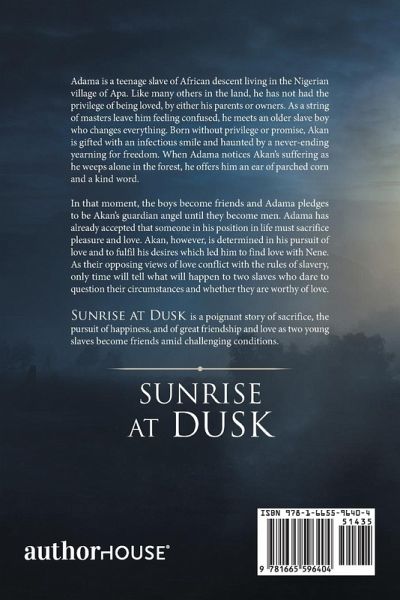 Adama is a teenage slave of African descent living in the Nigerian village of Apa. Like many others in the land, he has not had the privilege of being loved, by either his parents or owners. As a string of masters leave him feeling confused, he meets an older slave boy who changes everything. Born without privilege or promise, Akan is gifted with an infectious smile and haunted by a never-ending yearning for freedom. When Adama notices Akan's suffering as he weeps alone in the forest, he offers him an ear of parched corn and a kind word. In that moment, the boys become friends and Adama pledges to be Akan's guardian angel until they become men. Adama has already accepted that someone in his position in life must sacrifice pleasure and love. Akan, however, is determined in his pursuit of love and to fulfill his desires. As their opposing views of love conflict with the rules of slavery, now only time will tell what will happen to two slaves who dare to question their circumstances and whether they are worthy of love. Sunrise at Dusk is a poignant story of sacrifice, the pursuit of happiness, and of great friendship and love as two young slaves become friends amid challenging conditions.