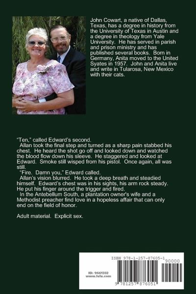 "Ten," called Edward's second. Allan stepped and turned. The waves washed over them and the audience gave its applause. "They are applauding you, my love," she had said. Allan looked up at the painted sky and smiled. A sharp pain stabbed him, and he heard the shot go off. He looked down at his side and watched the blood flow down his sleeve. He staggered and looked at Edward. Smoke still wisped from his pistol. Once again, all was still. "Fire. Damn you," Edward called. Allan's his vision blurred. He took a deep breath and steadied himself. Edward's chest was in his sights. He held the pistol, his arm rock steady, now. He put his finger around the trigger and fired. In the Antebellum South, Susanna Williams, a plantation owner's wife, and Allan Collins, a Methodist Preacher, find love in a hopeless affair that can only end on the field of honor. Adult material. Explicit Sex.