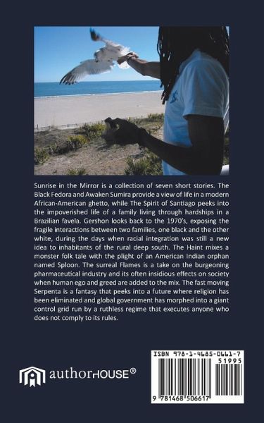 Sunrise in the Mirror is a collection of seven short stories. The Black Fedora and Awaken Sumira provide a view of life in a modern African-American ghetto, while The Spirit of Santiago peeks into the impoverished life of a family living through hardships in a Brazilian favela. Gershon looks back to the 1970's, exposing the fragile interactions between two families, one black and the other white, during the days when racial integration was still a new idea to inhabitants of the rural deep south. The Haint mixes a monster folk tale with the plight of an American Indian orphan named Sploon. The surreal Flames is a take on the burgeoning pharmaceutical industry and its often insidious effects on society when human ego and greed are added to the mix. The fast moving Serpenta is a fantasy that peeks into a future where religion has been eliminated and global government has morphed into a giant control grid run by a ruthless regime that executes anyone who does not comply to its rules.