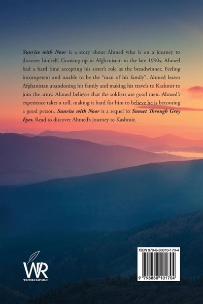 Sunrise with Noor is a story about Ahmed who is on a journey to discover himself. Growing up in Afghanistan in the late 1990s, Ahmed had a hard time accepting his sister's role as the breadwinner. Feeling incompetent and unable to be the "man of his family", Ahmed leaves Afghanistan abandoning his family and making his travels to Kashmir to join the army. Ahmed believes that the soldiers are good men. Ahmed's experience takes a toll, making it hard for him to believe he is becoming a good person. Sunrise with Noor is a sequel to Sunset Through Grey Eyes. Read to discover Ahmed's journey to Kashmir.