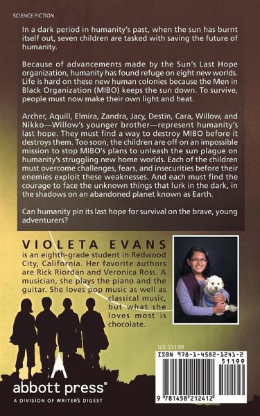In a dark period in humanity's past, when the sun has burnt itself out, seven children are tasked with saving the future of humanity. Because of advancements made by the Sun's Last Hope organization, humanity has found refuge on eight new worlds. Life is hard on these new human colonies because the Men in Black Organization (MIBO) keeps the sun down. To survive, people must now make their own light and heat. Archer, Aquill, Elmira, Zandra, Jacy, Destin, Cara, Willow, and Nikko-Willow's younger brother-represent humanity's last hope. They must find a way to destroy MIBO before it destroys them. Too soon, the children are off on an impossible mission to stop MIBO's plans to unleash the sun plague on humanity's struggling new home worlds. Each of the children must overcome challenges, fears, and insecurities before their enemies exploit these weaknesses. And each must find the courage to face the unknown things that lurk in the dark, in the shadows on an abandoned planet known as Earth. Can humanity pin its last hope for survival on the brave, young adventurers?