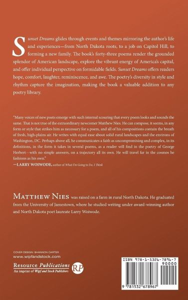 Sunset Dreams glides through events and themes mirroring the author's life and experiences--from North Dakota roots, to a job on Capitol Hill, to forming a new family. The book's forty-three poems render the grounded splendor of American landscape, explore the vibrant energy of America's capital, and offer individual perspective on formidable fields. Sunset Dreams offers readers hope, comfort, laughter, reminiscence, and awe. The poetry's diversity in style and rhythm capture the imagination, making the book a valuable addition to any poetry library.