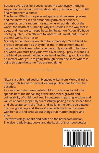 Because every perfect sunset leaves me with gypsy thoughts suspended in mid-air, with no destination, no place to go...until I finally find them a home! The Sunset Effect is my personal space, and because I process and feel in words, it's an emotionally driven experience…. a compilation of random musings, where I ponder over the world, the death of humanity, why life unfolds in the way that it does, and how we can cope best. Self-help; non-fiction; life hacks; poetry; quotes...I can attempt to label this if I must, but just as in the real world, I try not to. My only hope is for my words to be somebody's 2am friend, to provide consolation as they do for me. In those moments of despair and darkness, when you have only yourself to fall back on, when you must find your own silver lining, I pray this book is the friend you need, holding your hand and letting you know that no matter what you are going through, someone somewhere is going through the same. You are not alone!