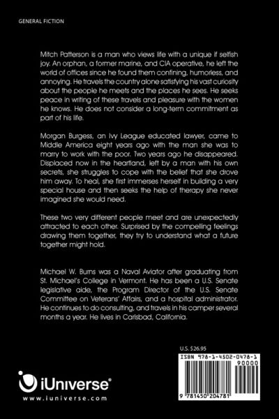 Mitch Patterson is a man who views life with a unique if selfish joy. An orphan, a former marine, and CIA operative, he left the world of offices since he found them confining, humorless, and annoying. He travels the country alone satisfying his vast curiosity about the people he meets and the places he sees. He seeks peace in writing of these travels and pleasure with the women he knows. He does not consider a long-term commitment as part of his life. Morgan Burgess, an Ivy League educated lawyer, came to Middle America eight years ago with the man she was to marry to work with the poor. Two years ago he disappeared. Displaced now in the heartland, left by a man with his own secrets, she struggles to cope with the belief that she drove him away. To heal, she first immerses herself in building a very special house and then seeks the help of therapy she never imagined she would need. These two very different people meet and are unexpectedly attracted to each other. Surprised by the compelling feelings drawing them together, they try to understand what a future together might hold.