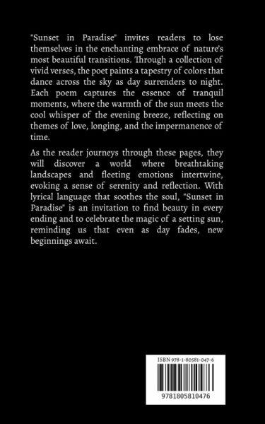 "Sunset in Paradise" invites readers to lose themselves in the enchanting embrace of nature's most beautiful transitions. Through a collection of vivid verses, the poet paints a tapestry of colors that dance across the sky as day surrenders to night. Each poem captures the essence of tranquil moments, where the warmth of the sun meets the cool whisper of the evening breeze, reflecting on themes of love, longing, and the impermanence of time. As the reader journeys through these pages, they will discover a world where breathtaking landscapes and fleeting emotions intertwine, evoking a sense of serenity and reflection. With lyrical language that soothes the soul, "Sunset in Paradise" is an invitation to find beauty in every ending and to celebrate the magic of a setting sun, reminding us that even as day fades, new beginnings await.