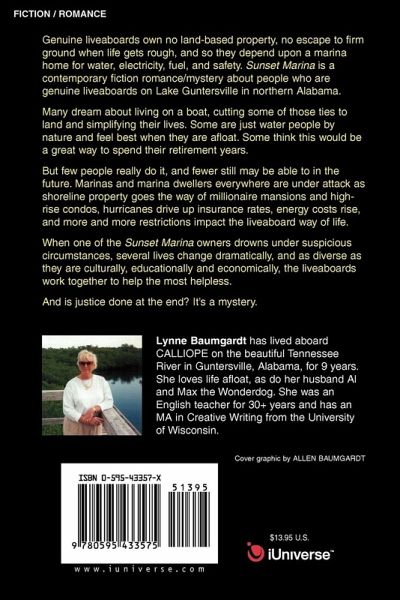 Genuine liveaboards own no land-based property, no escape to firm ground when life gets rough, and so they depend upon a marina home for water, electricity, fuel, and safety. Sunset Marina is a contemporary fiction romance/mystery about people who are genuine liveaboards on Lake Guntersville in northern Alabama. Many dream about living on a boat, cutting some of those ties to land and simplifying their lives. Some are just water people by nature and feel best when they are afloat. Some think this would be a great way to spend their retirement years. But few people really do it, and fewer still may be able to in the future. Marinas and marina dwellers everywhere are under attack as shoreline property goes the way of millionaire mansions and high-rise condos, hurricanes drive up insurance rates, energy costs rise, and more and more restrictions impact the liveaboard way of life. When one of the Sunset Marina owners drowns under suspicious circumstances, several lives change dramatically, and as diverse as they are culturally, educationally and economically, the liveaboards work together to help the most helpless. And is justice done at the end? It's a mystery.