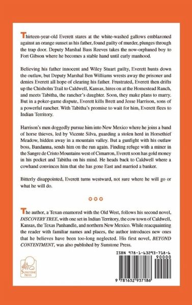 Thirteen-year-old Everett stares at the white-washed gallows emblazoned against an orange sunset as his father, found guilty of murder, plunges through the trap door. Deputy Marshal Bass Reeves takes the now-orphaned boy to Fort Gibson where he becomes a stable hand until early manhood. Believing his father innocent and Wiley Stuart guilty, Everett hunts down the outlaw, but Deputy Marshal Ben Williams wrests away the prisoner and denies Everett all hope of clearing his father. Frustrated, Everett then drifts up the Chisholm Trail to Caldwell, Kansas, hires on at the Homestead Ranch, and meets Tabitha, the rancher's daughter. Soon, they make plans to marry. But in a poker-game dispute, Everett kills Brett and Jesse Harrison, sons of a powerful rancher. With Tabitha's promise to wait for him, Everett flees to Indian Territory. Harrison's men doggedly pursue him into New Mexico where he joins a band of horse thieves, led by Vicente Silva, guarding a stolen herd in Horsethief Meadow, hidden away in a mountain valley. But a gunfight with his outlaw boss, Bandanna, sends him on the run again. Finding refuge with a miner in the Sangre de Cristo Mountains west of Cimarron, Everett soon has gold money in his pocket and Tabitha on his mind. He heads back to Caldwell where a cowhand convinces him that she has gone East and married a banker. Bitterly disappointed, Everett turns westward, not sure where he will go or what he will do.