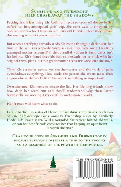 Sunshine and friendship help chase away the shadows. Packing is the last thing Kit Robinson needs to cross off the to-do list before her long-anticipated girls' trip. She can't wait to enjoy an icy cocktail under a hot Hawaiian sun with old friends, where they'll toast the keeping of a thirty-year promise. But when a terrifying tornado sends Kit racing through a dark night, her time in the sun is in jeopardy. Surprises await her back home. Has Kit's estranged mother returned? If that dreadful woman is back, chaos isn't far behind. Kit's fiancé does his best to persuade her to stick with her original travel plans, but her grandmother needs her. Shouldn't she stay? Then Kit stumbles across yet another secret and the wash of pain overshadows everything. How could the person she trusts more than anyone else in the world lie to her about something so important? Overwhelmed, Kit needs to escape the lies. Her lifelong friends know how deep her scars run and they'll understand why these latest bombshells are rocking Kit's carefully orchestrated world. Her friends will know what to do. Escape to the lush vistas of Hawaii in Sunshine and Friends, book two of The Kaleidoscope Girls women's friendship series by Kimberly Diede. Life leaves scars. Will a wounded Kit retreat behind old walls, or can her best friends convince her that keeping an open heart is worth the risk? Grab your copy of Sunshine and Friends today, because everyone deserves a trip to the tropics and a reminder of the power of forgiveness.