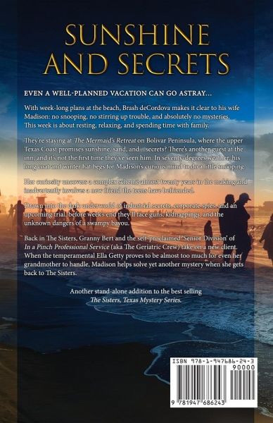 Even a well-planned vacation can go astray... With week-long plans at the beach, Brash deCordova makes it clear to his wife Madison: no snooping, no stirring up trouble, and absolutely no mysteries. This week is about resting, relaxing, and spending time with family. They're staying at The Mermaid's Retreat on Bolivar Peninsula, where the upper Texas Coast promises sunshine, sand, and ...secrets? There's another guest at the inn, and it's not the first time they've seen him. In seventy-degrees weather, his long coat and winter hat begs for Madison's curious mind to do a little snooping. Her curiosity uncovers a complex scheme almost twenty years in the making and inadvertently involves a new friend the teens have befriended. Drawn into the dark underworld of industrial secrets, corporate spies, and an upcoming trial, before week's end they'll face guns, kidnappings, and the unknown dangers of a swampy bayou. Back in The Sisters, Granny Bert and the self-proclaimed 'Senior Division' of In a Pinch Professional Service (aka The Geriatric Crew) take on a new client. When the temperamental Ella Getty proves to be almost too much for even her grandmother to handle, Madison helps solve yet another mystery when she gets back to The Sisters. Another stand-alone addition to the best selling The Sisters, Texas Mystery Series.
