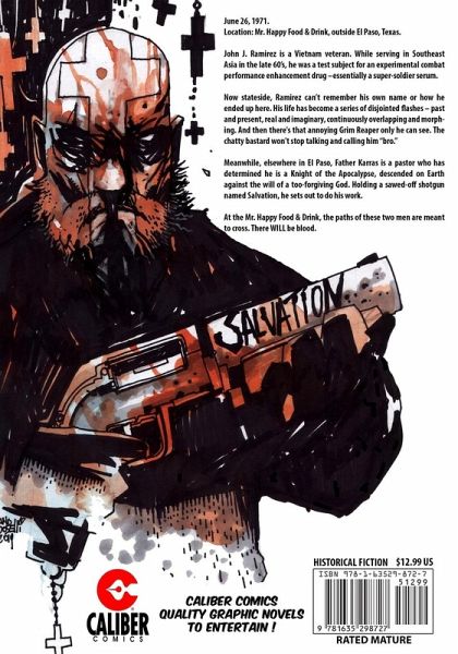 In a vein similar to UNIVERSAL SOLDIER meets DEADPOOL! June 26, 1971. Location: Mr. Happy Food & Drink, outside El Paso, Texas. John J. Ramirez is a Vietnam veteran. While serving in Southeast Asia in the late 60’s, he was a test subject for an experimental combat performance enhancement drug – essentially a super-soldier serum. Now stateside, Ramirez can’t remember his own name or how he ended up here. His life has become a series of disjointed flashes – past and present, real and imaginary, continuously overlapping and morphing. And then there's that annoying Grim Reaper only he can see. The chatty bastard won't stop talking and calling him "bro." Meanwhile, elsewhere in El Paso, Father Karras is a pastor who has determined he is a Knight of the Apocalypse, descended to Earth against the will of a too-forgiving God. Holding a sawed-off shotgun named Salvation, he sets out to do his work. At the Mr. Happy Food & Drink, the paths of these two men are meant to cross. There WILL be blood.