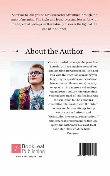 ""Cas is an autistic, transgender poet from Lincoln, with too much to say and not enough time. He writes of life, love, and loss, with the intention of making you laugh, cry, or question your existence (sometimes all three at once), usually wrapped up in a nonsensical analogy and more pop culture references than you can keep track of. His first love was the semicolon but he's now in a committed relationship with the Oxford comma and he may attempt to slip words such as 'quixotic' and 'vicissitudes' into casual conversation. If this occurs, it's recommended that you spray him with water like a cat. He'll soon stop. 'Cas, what the hell?' - Everyone""