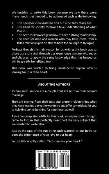 We decided to write this book because we saw there were many needs that needed to be addressed such as the following: The need for individuals to find out who they really are. The need for society to have a true understanding of what love is. The need for knowledge of how to have a strong relationship. The need for men and women who may have come from a failed relationship to be able to have the courage to try again Perhaps though the main reason for us writing this book was to share our story that through our experience anyone who reads and chooses to apply the same knowledge that has helped us will be greatly benefitted too. This book was written to bring Sunshine to anyone who is looking for it in their heart.