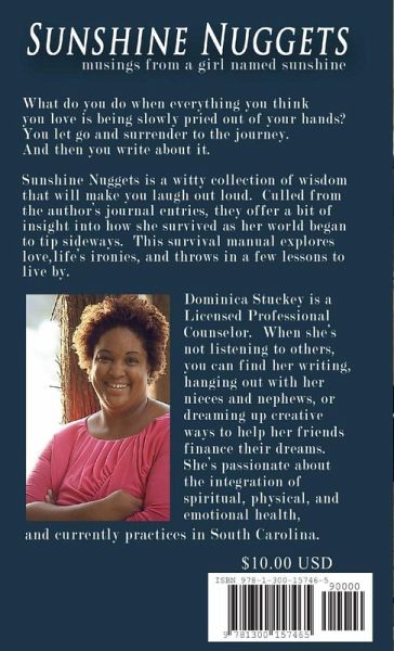 Sunshine Nuggets is a witty collection of wisdom that will make you laugh out loud. Culled from the author's journal entries, they offer a bit of insight into how she survived as her world began to tip sideways. These bite size bits of wisdom explore love, life's ironies, and throw in a few lessons to live by.