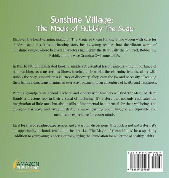 Discover the heartwarming magic of 'The Magic of Clean Hands,' a tale woven with care for children aged 2-5. This enchanting story invites young readers into the vibrant world of Sunshine Village, where beloved characters like Benny the Bear, Sally the Squirrel, Robbie the Rabbit, and the wise Grandpa Owl come to life. In this beautifully illustrated book, a simple yet essential lesson unfolds - the importance of handwashing. As a mysterious illness touches their world, the charming friends, along with Bubbly the Soap, embark on a journey of discovery. They learn the joy and necessity of keeping their hands clean, transforming an everyday routine into an adventure of health and happiness. Parents, grandparents, school teachers, and kindergarten teachers will find 'The Magic of Clean Hands' a precious tool in their arsenal of nurturing. It's a story that not only captivates the imagination of little ones but also instills a fundamental habit crucial for their wellbeing. The engaging narrative and vivid illustrations make learning about hygiene an enjoyable and memorable experience for young minds. Ideal for shared reading experiences and classroom discussions, this book is not just a story; it's an opportunity to bond, teach, and inspire. Let 'The Magic of Clean Hands' be a sparkling addition to your young reader's journey, laying the foundation for a lifetime of healthy habits.