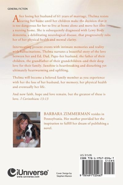After losing her husband of 61 years of marriage, Thelma resists leaving her home until her children make the decision that it is too dangerous for her to live at home alone and move her into a nursing home. She is subsequently diagnosed with Lewy Body dementia, a debilitating neurological disease, that progressively robs her of her physical health and mental clarity. Interweaving present events with intimate memories and reality with hallucinations, Thelma narrates a beautiful story of the love between her and Ed, Dad, Papa-her husband, the father of their children, the grandfather of their grandchildren-and their deep love for their family. Sunshine is heartbreaking and disturbing yet ultimately heartwarming and uplifting. Thelma will become a beloved family member as you experience with her the loss of her husband, her memory, her physical health and eventually her life. And now faith, hope and love remain, but the greatest of these is love. I Corinthians 13:13