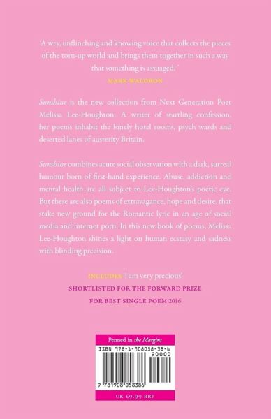 Sunshine is the new collection from Next Generation Poet Melissa Lee-Houghton. A writer of startling confession, her poems inhabit the lonely hotel rooms, psych wards and deserted lanes of austerity Britain. Sunshine; combines acute social observation with a dark, surreal humour born of first-hand experience. Abuse, addiction and mental health are all subject to Lee-Houghton's poetic eye. But these are also poems of extravagance, hope and desire, that stake new ground for the Romantic lyric in an age of social media and internet porn. In this new book of poems, Melissa Lee-Houghton shines a light on human ecstasy and sadness with blinding precision.