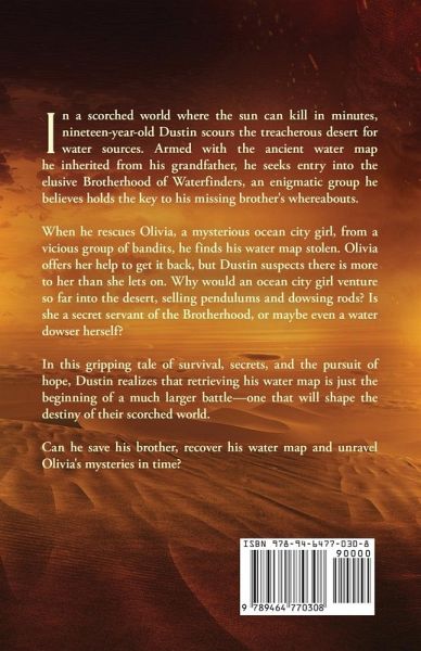 In a scorched world where the sun can kill in minutes, nineteen-year-old Dustin scours the treacherous desert for water sources. Armed with the ancient water map he inherited from his grandfather, he seeks entry into the elusive Brotherhood of Waterfinders, an enigmatic group he believes holds the key to his missing brother's whereabouts. When he rescues Olivia, a mysterious ocean city girl, from a vicious group of bandits, he finds his water map stolen. Olivia offers her help to get it back, but Dustin suspects there is more to her than she lets on. Why would an ocean city girl venture so far into the desert, selling pendulums and dowsing rods? Is she a secret servant of the Brotherhood, or maybe even a water dowser herself? In this gripping tale of survival, secrets, and the pursuit of hope, Dustin realizes that retrieving his water map is just the beginning of a much larger battle-one that will shape the destiny of their scorched world. Can he save his brother, recover his water map and unravel Olivia's mysteries in time?