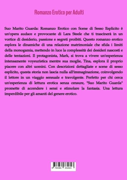 Suo Marito Guarda: Romanzo Erotico con Scene di Sesso Esplicito è un'opera audace e provocante di Lara Steele che ti trascinerà in un vortice di desiderio, passione e segreti proibiti. Questo romanzo erotico esplora le dinamiche di una relazione matrimoniale che sfida i limiti della monogamia, mettendo in luce la complessità dei desideri nascosti e delle tentazioni. Il protagonista, Mark, si trova a vivere un'esperienza intensamente voyeuristica mentre sua moglie, Tina, esplora il proprio piacere con altri uomini. Con descrizioni dettagliate e scene di sesso esplicito, questa storia non lascia nulla all'immaginazione, coinvolgendo il lettore in un viaggio sensuale e travolgente. Perfetto per chi cerca un'esperienza di lettura erotica senza censure, "Suo Marito Guarda" promette di accendere i sensi e stimolare la fantasia. Una lettura imperdibile per gli amanti del genere erotico.