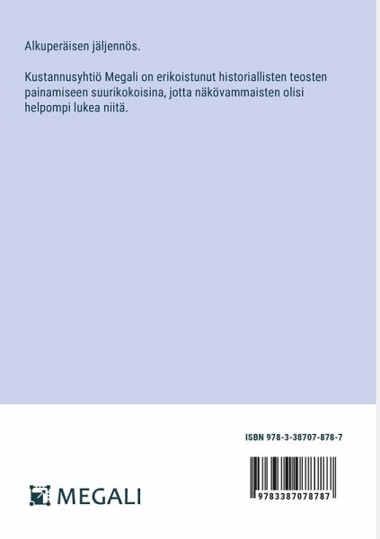 Alkuperäisen jäljennös. Kustannusyhtiö Megali on erikoistunut historiallisten teosten painamiseen suurikokoisina, jotta näkövammaisten olisi helpompi lukea niitä.