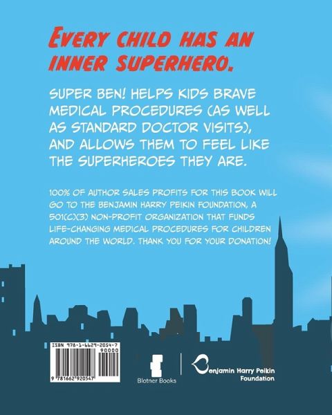 Every child has an inner superhero. Ben has always been a child willing to help his family and friends. He was sure that his inner hero was strong, if only there was a need for him to truly save the day. Then one fateful morning, that opportunity arrives. And the person he has the chance to save...is himself. In a fun, colorful, and light-hearted manner, Super Ben! makes kids feel better about facing the need for surgery. In fact, it makes them feel like superheroes! Super Ben! not only serves to comfort its young readers in braving surgery, it actually helps deserving children from all around the world receive life-changing medical procedures. 100% of the author's royalties from the sale of this book will be donated to The Benjamin Harry Peikin Foundation, a non-profit that partners with world-renowned doctors to provide pediatric airway surgery for children in need.