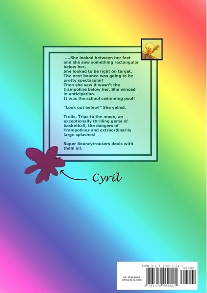 For 5-10 year olds. The adventures of Super Bouncytrousers. A young girl with an unusual talent. Trolls, Trips to the moon, an exceptionally thrilling game of basketball, the dangers of Trampolines and extraordinarily large splashes! Super Bouncytrousers deals with them all.