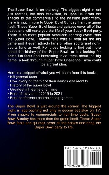 The Super Bowl is on the way! The biggest night in not just football, but also television, is upon us. From the snacks to the commercials to the halftime performers, there is much more to Super Bowl Sunday than the game itself. These Super Bowl facts and quizzes cover all of the bases and will make you the life of your Super Bowl party. There is no more popular American sporting event than the Super Bowl. Football fans wait all year for the big game and it even attracts fans of other sports and non-sports fans as well. For those looking to find out more about the history of the Super Bowl, or just looking for some fun facts and interesting trivia items about the big game, a look through Super Bowl Challenge Trivia could be a great idea. Here is a snippet of what you will learn from this book:Nfl general facts How every nfl team got their names and identity History of the super bowl Greatest nfl teams of all time Best nfl players of 2019 to 2021 Best conference championship games The Super Bowl is just around the corner! The biggest night is approaching not only in soccer but also on TV. From snacks to commercials to half-time casts, Super Bowl Sunday has more than the game itself. These Super Bowl facts and quizzes cover all the basics and bring the Super Bowl party to life.