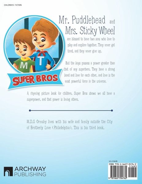 Mr. Puddlehead and Mrs. Sticky Wheel are blessed to have two sons who love to play and explore together. They never get tired, and they never give up. But the boys possess a power greater than that of any superhero. They have a strong bond and love for each other, and love is the most powerful force in the universe. A rhyming picture book for children, Super Bros shows we all have a superpower, and that power is loving others.