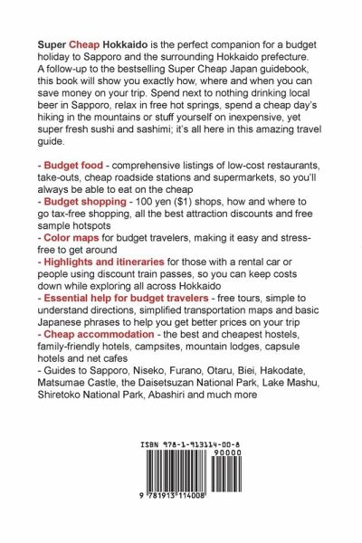 Super Cheap Hokkaido is the perfect companion for a budget holiday to Sapporo and the surrounding Hokkaido prefecture. A follow-up to the bestselling Super Cheap Japan guidebook, this book will show you exactly how, where and when you can save money on your trip. Spend next to nothing drinking local beer in Sapporo, relax in free hot springs, spend a cheap day’s hiking in the mountains or stuff yourself on inexpensive, yet super fresh sushi and sashimi; it’s all here in this amazing travel guide. Inside the Super Cheap Hokkaido guide book: Budget food - comprehensive listings of low-cost restaurants, take-outs, cheap roadside stations and supermarkets, so you’ll always be able to eat on the cheap Budget shopping - 100 yen ($1) shops, how and where to go tax-free shopping, all the best attraction discounts and free sample hotspots Color maps for budget travelers, making it easy and stress-free to get around Highlights and itineraries for those with a rental car or people using discount train passes, so you can keep costs down while exploring all across Hokkaido Essential help for budget travelers - free tours, simple to understand directions, simplified transportation maps and basic Japanese phrases to help you get better prices on your trip Cheap accommodation - the best and cheapest hostels, family-friendly hotels, campsites, mountain lodges, capsule hotels and net cafes Guides to Sapporo, Niseko, Furano, Otaru, Biei, Hakodate, Matsumae Castle, the Daisetsuzan National Park, Lake Mashu, Shiretoko National Park, Abashiri and much more The Super Cheap Hokkaido travel book is perfect for backpackers, budget travelers, families on a tight budget, students and those who are new to Hokkaido. Explore this spectacular island while keeping your bank balance happy! Also consider Super Cheap Japan (ISBN 978-1-9998100-0-9) for a guide to Japan’s highlights on the main island of Honshu and Super Cheap Tokyo (ISBN 978-1-9998100-5-4) for the capital and Kanto region.