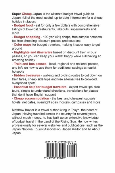 Super Cheap Japan is the ultimate budget travel guide to Japan, full of the most useful, up-to-date information for a cheap holiday in Japan. With extensive tax-free shopping, crazily discounted train passes and an unbelievable exchange rate, there has never been a better time to visit. Unlike other guides, this book shows you exactly how, where and when you can save money. Go shopping for $4 clothes in Tokyo, enjoy inexpensive hikes in Nikko, or visit Kyoto's beautiful shrines and gardens on the cheap; all with this super helpful guide. Inside the Super Cheap Japan guide book: Budget food - eat for only a few dollars with comprehensive listings of low-cost restaurants, takeouts, supermarkets and more Budget shopping - 100 yen ($1) shops, free sample hotspots, tax-free shopping, discount passes and coupons Color maps for budget travelers, making it super easy to get around Highlights and itineraries based on discount train or bus passes, so you can keep your wallet happy while still having an amazing holiday Train and bus passes - local, regional and national passes, and info on how to use them for additional savings at tourist hotspots Hidden treasures - walking and cycling routes to cut down on train fares, cheap side trips and free alternatives to crowded, overpriced spots Essential help for budget travelers - expert travel tips, free tours, simple to understand directions, translations for places that don't have English support Cheap accommodation - the best and cheapest capsule hotels, net cafes, overnight spas, hostels, campsites and more Guides to Tokyo, Kyoto, Osaka, Nara, Hiroshima, Mt Fuji, Miyajima, Himeji Castle, Kobe, Yokohama, Kamakura, Nikko, Hakone, Kansai, Kanto, as well as great off-the-beaten-track places nearby This book is perfect for backpackers, budget travelers, families on a tight budget, students and those who are new to Japan. Get the most out of this amazing country, without burning a hole in your wallet! Also consider Super Cheap Hokkaido (ISBN 978-1-9131140-0-8) for Sapporo and the Hokkaido prefecture and Super Cheap Tokyo (ISBN 978-1-9998100-5-4) for the capital and Kanto region. Reviews "In Super Cheap Japan the author fulfils his mission to keep Japan both affordable and authentically enjoyable for tourists. There is a good balance between an overview of the usual tourist spots and quirkier recommendations that allows travellers to maximise their enjoyment of a singular country while minimising their budget." - Japan Visitor "Lots of great tips and tricks for saving money on your Japan visit! The book covers many areas in great detail, and it is certainly a very useful book for anybody planning a trip to Japan" - Abby Denson, author of the bestselling Cool Japan Guide "Want to travel to Japan but on a budget? Then check out Super Cheap Japan for great money saving ideas" - Doki Doki "A must have book if you are traveling to Japan, it has all the essential information that you might need" - Hector Garciao, author of the bestselling A Geek in Japan