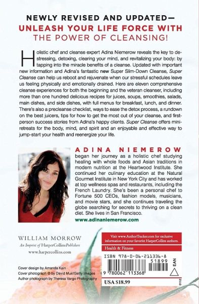 Newly Revised and Updated—Unleash your life force with the power of cleansing! Holistic chef and cleanse expert Adina Niemerow reveals the key to de-stressing, detoxing, clearing your mind, and revitalizing your body: by tapping into the miracle benefits of a cleanse. Updated with important new information and Adina’s fantastic new Super Slim-Down Cleanse, Super Cleanse can help us reboot and rejuvenate when our stressful schedules leave us feeling physically and emotionally drained. Here are eleven comprehensive cleanse experiences for both the beginning and the veteran cleanser, including more than one hundred delicious recipes for juices, soups, smoothies, salads, main dishes, and side dishes, with full menus for breakfast, lunch, and dinner. There’s also a precleanse checklist, ways to ease the detox process, a rundown on the best juicers, tips for how to get the most out of your cleanse, and first-person success stories from Adina’s happy clients. Super Cleanse offers mini-retreats for the body, mind, and spirit and an enjoyable and effective way to jump-start your health and reenergize your life.