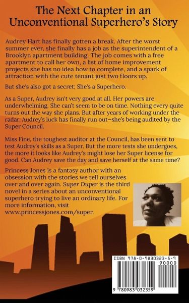 The Next Chapter in an Unconventional Superhero’s Story Audrey Hart has finally gotten a break. After the worst summer ever, she finally has a job as the superintendent of a Brooklyn apartment building. The job comes with a free apartment to call her own, a list of home improvement projects she has no idea how to complete, and a spark of attraction with the cute tenant just two floors up. But she's also got a secret; She's a Superhero. As a Super, Audrey isn't very good at all. Her powers are underwhelming. She can’t seem to be on time. Nothing every quite turns out the way she plans. But after years of working under the radar, Audrey’s luck has finally run out--she’s being audited by the Super Council. Miss Fine, the toughest auditor at the Council, has been sent to test Audrey’s skills as a Super. But the more tests she undergoes, the more it looks like Audrey's might lose her Super license for good. Can Audrey save the day and save herself at the same time? Super Duper is the third in a series about an unconventional superhero trying to live an ordinary life. For more information, visit www.princessjones.com/super.