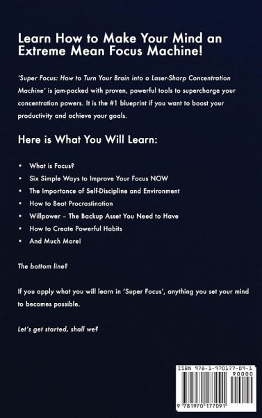 Learn How to Supercharge Your Focus! Why do successful people get so much more done in a day? Because they have mastered the power of deep focus. Let's face it: we all have the same 24 hours in a day. Yet, they're stacking cash, and you're not. Not yet... Now, I'm not saying that developing super focus will make you a millionaire. But I can guarantee you one thing: you won't get there if you can't master the ability to concentrate! Get Your Copy of 'Super Focus' In today's world, distractions are all around us. Notifications, email, social media, and advertising are all vying for your attention. If you think about it, it's really a miracle we get shit done at all! But this also creates opportunity. For you. If you are able to take control of your life and become a focus master, the world is at your feet. Super Focus is a powerful asset to have, regardless of what you do. Really, if you want to live a fulfilled and productive life, set goals, and achieve them, understanding how you can concentrate deeply is where it all starts! Why You Should Check Out 'Super Focus' How would you like to be more productive and do it with more ease? 'Super Focus: How to Turn Your Brain into a Laser-Sharp Concentration Machine' is jam-packed with proven, powerful tools to supercharge your concentration powers. It is the #1 blueprint if you want to boost your productivity and achieve your goals. What's most important: I will take you by the hand and teach you everything you need to know to become a super focus master. Here is What You Will Learn: - What is Focus? - Six Simple Ways to Improve Your Focus NOW - The Importance of Self-Discipline and Environment - How to Beat Procrastination - Willpower - The Backup Asset You Need to Have - How to Create Powerful Habits - And Much More! And Here's The Cool Thing: at the end of every chapter, you will find Action Steps. These allow you to (1) reflect on what you learned, and (2) encourage you to take action. Finally, as a FREE & EXCLUSIVE BONUS, you'll also get the chapter 'What is Accelerated Learning?' from my other popular book 'Accelerated Learning'. To recap: If you apply what you will learn in 'Super Focus', anything you set your mind to becomes possible. So, let's get started, shall we? Take action now! Scroll to the top of this page and click the 'Buy Now' button.