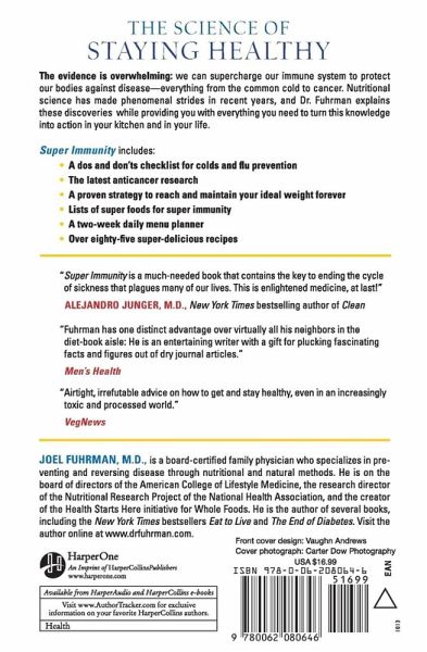 The Science of Staying Healthy The evidence is overwhelming: we can supercharge our immune system to protect our bodies against disease?everything from the common cold to cancer. Nutritional science has made phenomenal strides in recent years, and Dr. Fuhrman explains these discoveries while providing you with everything you need to turn this knowledge into action in your kitchen and in your life. Super Immunity includes: * A dos and don'ts checklist for colds and flu prevention * The latest anticancer research * A proven strategy to reach and maintain your ideal weight forever * Lists of super foods for super immunity * A two-week daily menu planner * Over eighty-five super-delicious recipes