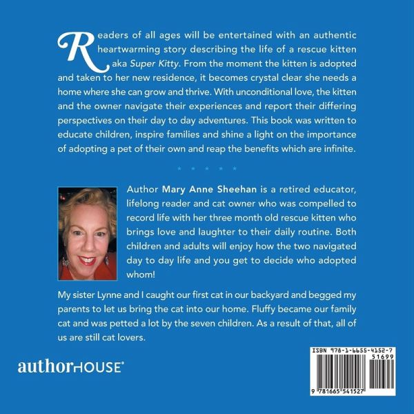 Readers of all ages will be entertained with an authentic heartwarming story describing the life of a rescue kitten aka Super Kitty. From the moment the kitten is adopted and taken to her new residence, it becomes crystal clear she needs a home where she can grow and thrive. With unconditional love, the kitten and the owner navigate their experiences and report their differing perspectives on their day to day adventures. This book was written to educate children, inspire families and shine a light on the importance of adopting a pet of their own and reap the benefits which are infinite.